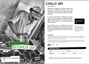 Conférences interactives; présentation d’une chambre d’adolescent avec ses revues, ses k7, ses posters et ses livres. Chilly Jay raconte son histoire et son métier au travers la découverte du disque, du sampling, ou des techniques de mixs.